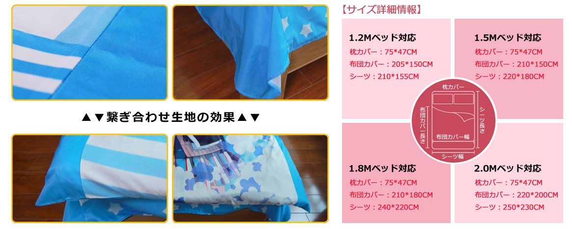 製作工芸などの原因で、色々広さサイズ適応する為に、145cm広さ超えした布団カバーとシーツは、左右両側は同じ色生地で繋ぎ合わせていただきます。予めてご了承ください。繋ぎ合わせ生地の色はセット内容展示図で表明致しました。